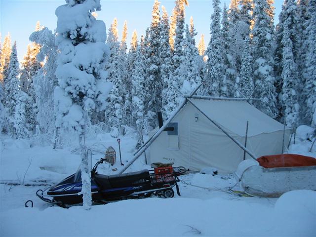 I’ve since improved the retreat with a semi-permanent wooden tent frame and insulated floor. Warmer, but we miss the smell of fresh spruce boughs. The snow sliding off the roof no longer pushes the tent walls farther and farther into our living space over the course of the winter.